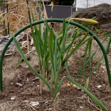 ミニアイリスに続き、ミニ水仙も玄関の中にしまっておいたら、首が長くなってしまったので、庭に。花って早いな。咲いてるのを買ってきちゃうから、3週で庭行き。