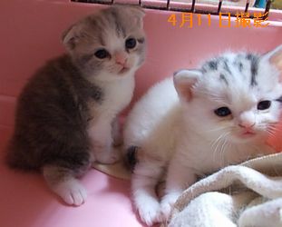 白ぽい子立ち耳と、灰色ぽい子折れ耳
