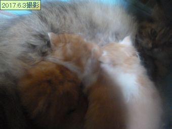 優☆もじゃ の子供たち~レッド&ホワイト・クリーム&ホワイト・ブラック&ホワイトめっちゃ可愛いんだけど、一番先に写真とれば、とれる、でも、みんなにご飯配った頃来ると、おっぱい飲み始めちゃうんです・・・仕方ない、今度、砂とか散らかってるけど、次、お見せします。キラ系の可愛い顔です(^^)